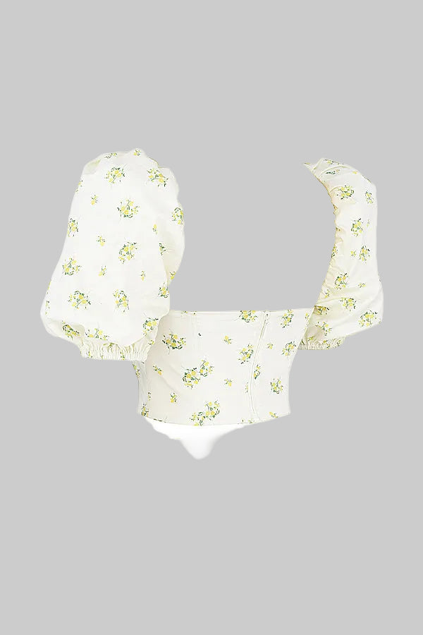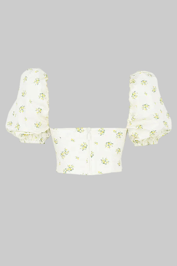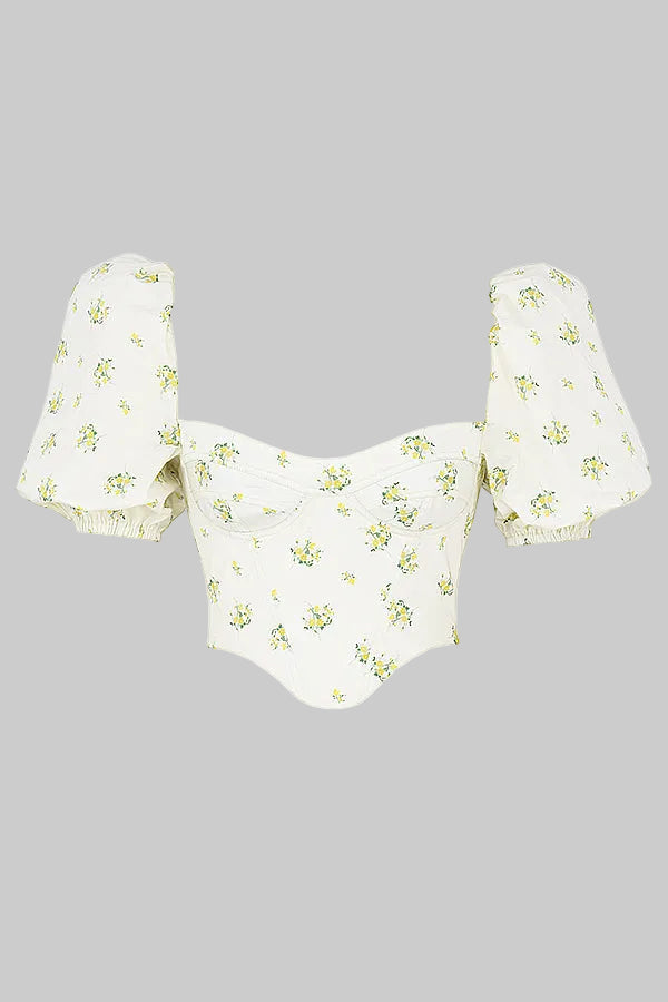 Ge din garderob en romantisk touch med Alyra, en charmig korsettopp som sömlöst kombinerar klassisk elegans med en lekfull, feminin känsla. Det delikata blommönstret, de feminina puffärmarna och den figurnära korsettpassformen gör denna topp till ett riktigt blickfång. Perfekt för en somrig brunch, en dejtkväll eller ett speciellt tillfälle där du vill stråla.