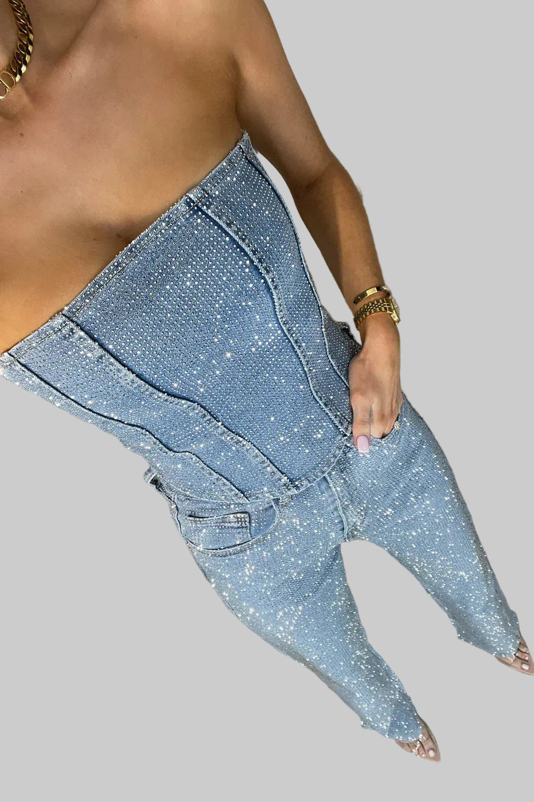 Ge din garderob en sofistikerad uppgradering med Averia, en strapless jumpsuit som kombinerar lyx, komfort och modern stil. Den glansiga, lätt glittriga tyget skapar en elegant finish, medan den kroppsnära passformen framhäver siluetten på ett smickrande sätt. Perfekt för galaer, fester eller exklusiva middagar där du vill stå ut med subtil glamour.