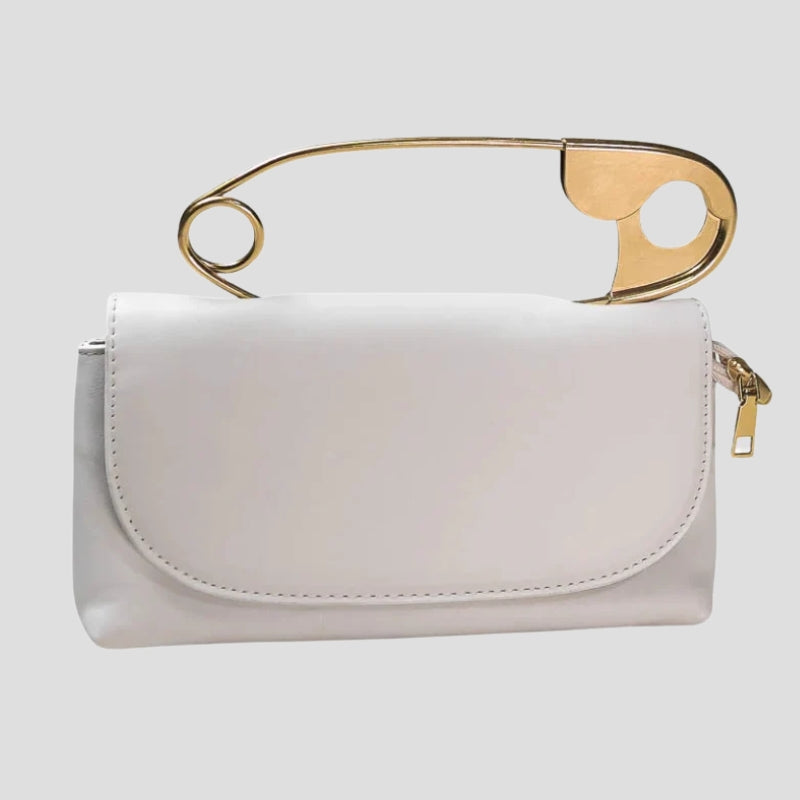 Althéne-väskan är en perfekt balans mellan sofistikerad elegans och avantgardistisk design. Det oversized säkerhetsnålsformade handtaget ger en edgy twist till den annars minimalistiska silhuetten – en väska för dig som vill kombinera stil med personlighet.
