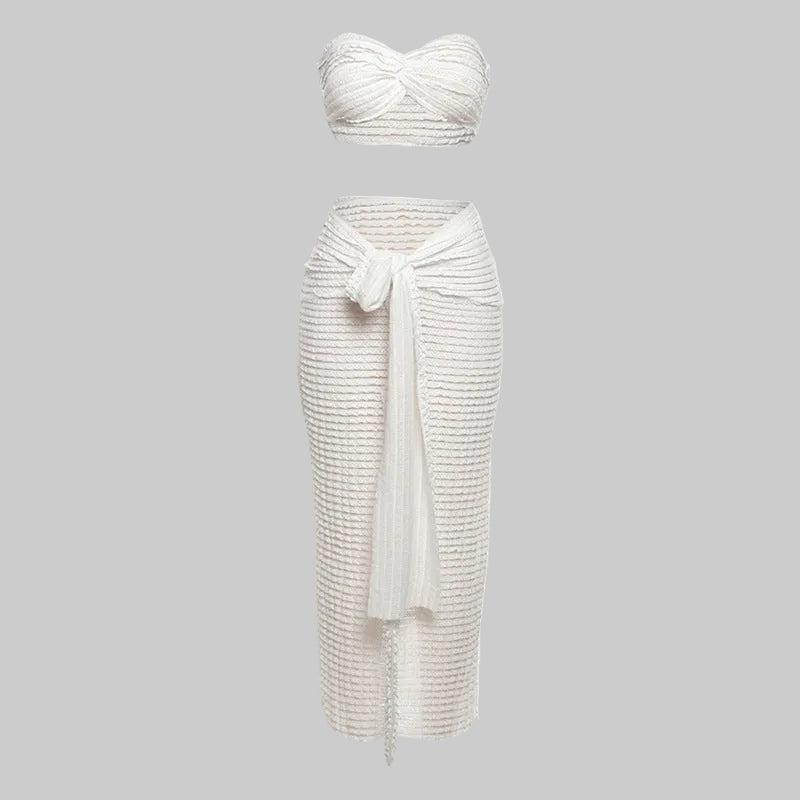 Upptäck Sylvienne Set, en lätt och somrig set i klarvit färg. Med en strapless topp med dekorativ knut och en lång kjol med subtil slits framtill, känns tyget mjukt och följsamt mot kroppen. Perfekt för stranden, semester eller kvällsutflykter – Sylvienne ger dig en stilfull look utan ansträngning.